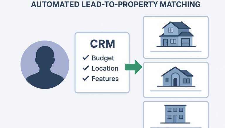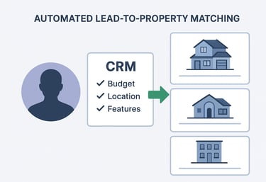 Automated lead-to-property matching — CRM automatically matches leads with appropriate properties based on preferences (budget, location, features) and surfaces relevant listings.